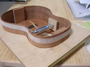 ご覧のように、モールドから切り離した余りのベニヤ板を サウンドボードにあてがっています。 ゆがみ防止には必須です。 |