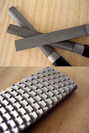 木彫ヤスリ 2005.5.29 拡大写真を見ればおわかりのようにトゲトゲの木工(鬼目)ヤスリとは 明らかに違います。 まだ、本格的には試していませんが、黒檀(エボニー)を削ったところ サクサク気持ちよく平滑に削れました。 紙ヤスリが必要ないぐらいです!! 過去に木彫刻をやっていた頃、スタンリー社の「サフォーム」にも感激しましたが 切れ味と言い使い勝手と言い、このヤスリはそれ以上です。!! 具体的には、「ネックのあら削り、仕上げを兼ねる」、「ブリッジのウイング部の削り」 など、いろいろ使い道があります。 今後、製作記事の中でレポートしたいと思います。 1300円〜1850円(記事掲載現在)といい値段がしますが、 それだけの価値はあると思います。 詳しくは岩崎ヤスリ工業株式会社ホームページをご覧下さい。 |