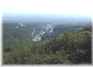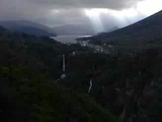 | 日光華厳の滝、中禅寺湖を望む! 右上の斜面は男体山です。カメラは随時、周辺の様子を 切替ながら見せてくれます。 |