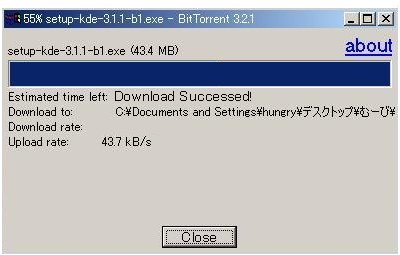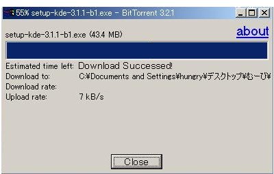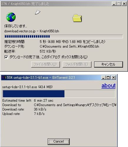 | BitTorrent(ビットトレント)の使い方。 まずBitTorrentを始めるには、 まずはクライアント(提供者)をインストールします。 あとは特にやることはありません。 ダウンロードも至って簡単。 IEのようなダウンロード画面が表示されるので BitTorrentを使っているという意識をあまり感じさせません。 ![]() IEとの比較画面 【インストール手順】 1.まずBitTorrentのクライアントをダウンロードします。 ”コレ”です 上記のようなファイルが落ちてくると思います。 2.次に上記のファイルを実行すれば自動的にインストーラーが実行されます。 上記のダイアログが表示されればインストール完了です。 OSによって多少表示の仕方が違うかもしれませんが、 こんなカンジのモノが表示されればOKです。 (時々海外サイトへ飛ばされる場合がありますが、 上記のダイアログさえ表示していれば完全無視しちゃって構いません!) 3.以上で終了です。 お疲れさまでしたm( _ _ )m 【BitTorrentを使ってダウンロード】 1.ダウンロード こちらで用意したWebページに貼られたトレントファイルをクリックするだけです。 あとは自動的にBitTorrentが立ちあがり、保存先を指定するだけです。 本当にダウンロードはあっけないほど簡単です。 (※トレントファイルには祭の楽曲が圧縮されています) 2.ファイルの保存先の指定 BitTorrentが起動すると、 保存先を指定します。 (この際、予め祭専用にフォルダなどを作って置くと分かり易いと思います。) 3.ダウンロード中 ![]() ダウンロード中に上記のダイアログが表示されています。 またダウンロード開始するまで多少タイムラグがありますが、 エラーさえ出なければ次第に転送が始まると思います。 4.ダウンロードの完了 ダウンロードが完了すると、ファンファーレが鳴るとかそういう派手な事はなしに、 地味に表示されているメッセージが変わるだけです。 ![]() Estimated time left: Download Successed!に変化すればDL無事完了です。 またボタンもCloseになっていればOKです。 ここまででダウンロードは終了致しますが、 せっかくのP2Pです! 他の方にも同じファイルを簡単に転送出来るのがP2Pの本来の使い方です。 【BitTorrentを使ってアップロード】 1.先ほどダウンロードし終えた時に表示されたダイアログを閉じずに残しておきます。 ボタンがCloseになっている状態で そのまま閉じれば終了なのですが、 そのまま放置してみましょう!! 次の人がダウンロードしようとすると、、、 ![]() Upload rateでどんどんアップロードされていくのが分かります。 2.あとはそのまま放置です(笑) 【ネズミ講式、倍々ゲーム】 1.上記のダイアログを閉じずにアップロードしていくと、 次から次へと連鎖するように転送されていきます。 2.もちろん、自分が次にダウンロードしようとすると、 相手側でも先に落している方からアップロードされていくわけですから、 ”ダウンロードすればする程”、”アップロードすればする程”、 その数が増してゆき、 ”速度も増していく”、 と言う大変面白い仕組みになっています。 3.もし回線に自信の無い方いらっしゃったとしても、 他の方でFTTH(光回線)などが繋がってきたら、、、、? そりゃぁもぅ最強な程に速度が増してくれます。 要はお互いをカバーし合いながら、沢山の回線を繋げていくゲームのようなモノです。 主な仕組みは ![]() クライアント同士の線が繋がれば繋がるほど速度が増していきます。 【注意点】 上記のシステムにより、接続した人数が多ければ多いほど、 速度も増し、安定したファイル転送が行われます。 その際、以下のような注意点がございます。 ・保存したファイルを移動させてしまう(保存場所を変えてしまう) ・ダウンロードが終了したらダイアログを閉じてしまう この場合には次の方への転送が出来なくなってしまいます。 なるべく多くの方に接続して欲しいので、 ダウンロードばかりではなく、アップロードにもご協力下さい。 またFTTHの方には是非、ダイアログを閉じずに速度アップのお手伝いをお願い致します! また、1ファイルに付き1ダイアログが表示されてしまいます。 アップロードする際には、ダウンロードしたファイルの数分、 ダイアログも残しておかなければなりません。 邪魔だとは思いますが、なるべく閉じずに残しておく事をお願い致します。 もしダイアログを一度閉じてしまったけど、 アップロードを行いたい場合には、 再度、同じファイルをダウンロードしてみて下さい。 (その際、保存場所は同一に) 一瞬でダウンロードが終了し、あとはアップロードの待機状態になると思います。 ダウンロードが全て終了した方はアップロードのご援助お願い致します。 ルーター/ファイアーウォールソフト等を使用している場合 BitTorrentはアップロード用にTCPポート6881〜6889を使用します。 ルーターやファイアーウォール、セキュリティソフトなどを使っている場合は、 上記のTCPポートを静的マスカレード/逆NAT/ポートフォワード/解放などするように設定